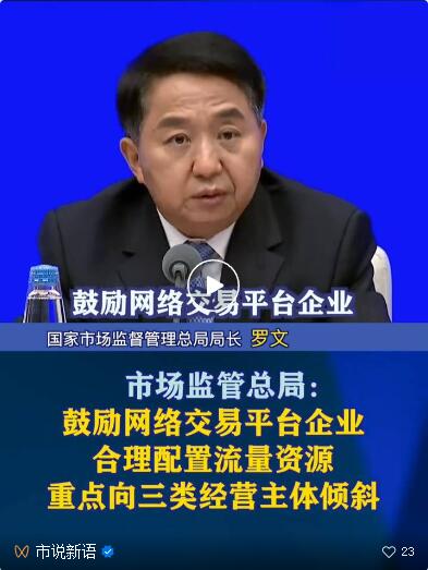 ● 市場監(jiān)管總局將出臺《關(guān)于引導(dǎo)網(wǎng)絡(luò)交易平臺發(fā)揮流量積極作用、扶持中小微經(jīng)營主體發(fā)展的意見》。