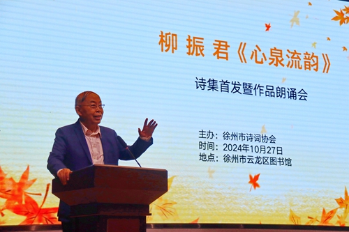 黃淮網(wǎng)(老 驥/文 張傳禮/攝) 金秋時(shí)節(jié),美麗徐州,天高云淡,涼風(fēng)送爽;楓葉如火,丹桂飄香。云龍區(qū)圖書(shū)館內(nèi),群賢畢至,俊采星馳。10月27日上午10時(shí),柳振君新著《心泉流韻》新聞發(fā)布會(huì)序幕開(kāi)啟。參加盛會(huì)的領(lǐng)導(dǎo)和專(zhuān)家學(xué)者有:江蘇師范大學(xué)原校黨委書(shū)記、校長(zhǎng)徐放鳴,江蘇省詩(shī)詞協(xié)會(huì)副會(huì)長(zhǎng)、徐州市人大常委會(huì)原副主任徐崇先,中國(guó)礦業(yè)大學(xué)教授、博士生導(dǎo)師肖慶元,徐州市老新聞工作者協(xié)會(huì)會(huì)長(zhǎng)徐勝民,徐州市作家協(xié)會(huì)原副主席李繼玲,云龍區(qū)文體旅局副局長(zhǎng)張美麗。另外還有來(lái)自本市及外地的作家、書(shū)家、畫(huà)家、朗誦藝術(shù)家和新聞媒體記者。會(huì)議由徐州著名主持人雅君和李佳璐主持。