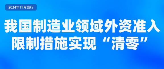 國家發(fā)展改革委、商務(wù)部于2024年9月8日發(fā)布第23號令,全文發(fā)布《外商投資準入特別管理措施(負面清單)(2024年版)》,自2024年11月1日起施行!锻馍掏顿Y準入特別管理措施(負面清單)(2021年版)》同時廢止。2024年版全國外資準入負面清單限制措施由31條減至29條,刪除了“出版物印刷須由中方控股”,以及“禁止投資中藥飲片的蒸、炒、炙、煅等炮制技術(shù)的應(yīng)用及中成藥保密處方產(chǎn)品的生產(chǎn)”2個條目,制造業(yè)領(lǐng)域外資準入限制措施實現(xiàn)“清零”。對負面清單之外的領(lǐng)域,按照內(nèi)外資一致原則管理,給予外商投資企業(yè)國民待遇。