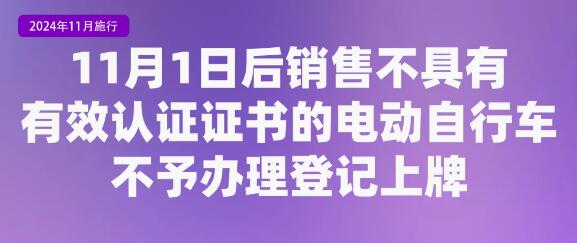 市場監(jiān)管總局等四部門聯(lián)合印發(fā)《關(guān)于加強電動自行車產(chǎn)品準入及行業(yè)規(guī)范管理的公告》!豆妗诽岢觯2024年11月1日起,對新提出認證委托的電動自行車,應(yīng)符合強制性國家標準及修改單要求,經(jīng)過認證并標注認證標志后,方可出廠、銷售、進口或者在其他經(jīng)營活動中使用。認證委托人可自愿提前實施。各地公安機關(guān)交管部門強化電動自行車登記上牌管理,嚴格核驗銷售發(fā)票、產(chǎn)品合格證和強制性產(chǎn)品認證證書等。2024年11月1日起,對2024年10月31日前銷售的、因未完成認證變更而暫停認證證書的電動自行車可辦理登記上牌;對2024年11月1日后銷售的、不具有有效認證證書的電動自行車不予辦理登記上牌,并將有關(guān)線索及時移送同級市場監(jiān)管部門。