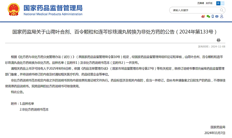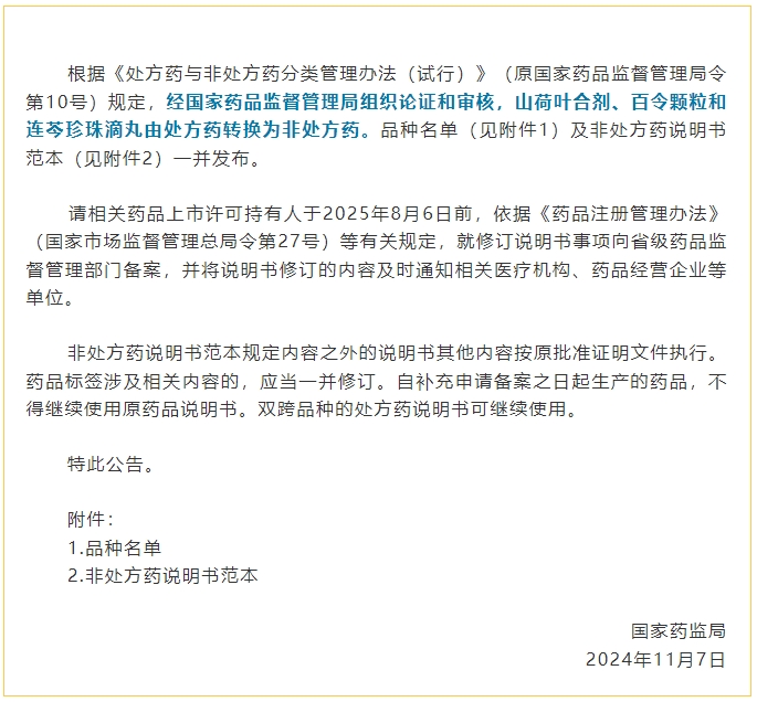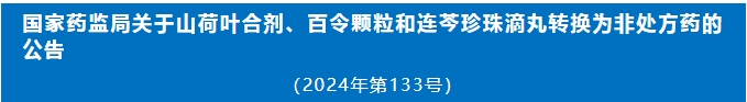 近日國(guó)家藥監(jiān)局網(wǎng)站發(fā)布關(guān)于山荷葉合劑等4種處方藥轉(zhuǎn)換為非處方藥的公告全文如下↓↓↓