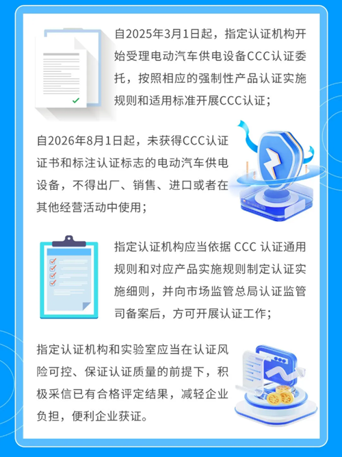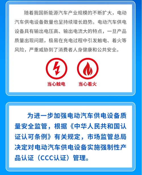 近日,市場監(jiān)管總局決定對電動汽車供電設備實施強制性產(chǎn)品認證(CCC認證)管理。自2025年3月1日起,開始受理認證委托;自2026年8月1日起,未獲得CCC認證證書和標注認證標志的電動汽車供電設備,不得出廠、銷售、進口或者在其他經(jīng)營活動中使用。