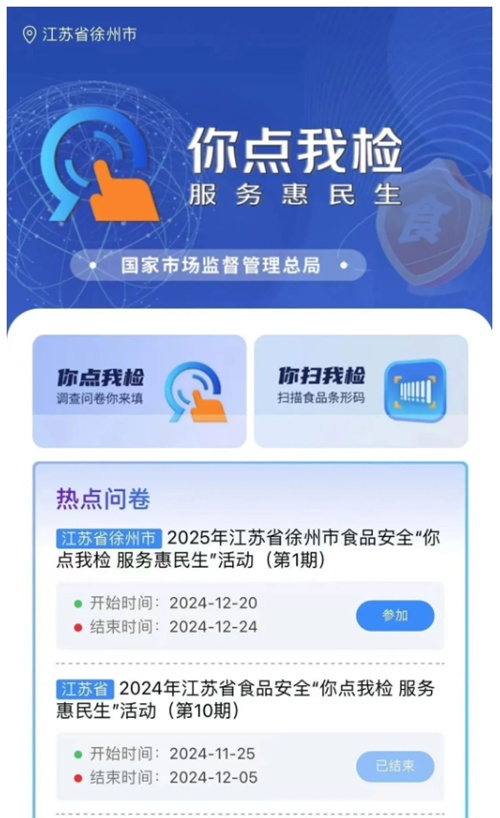步驟二:定位在徐州的朋友選擇“2025年江蘇省徐州市食品安全‘你點(diǎn)我檢 服務(wù)惠民生’活動(dòng)(第1期)”。