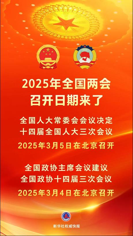 全國人大常委會會議12月25日表決通過了關于召開十四屆全國人大三次會議的決定。根據(jù)決定,十四屆全國人大三次會議于2025年3月5日在北京召開。