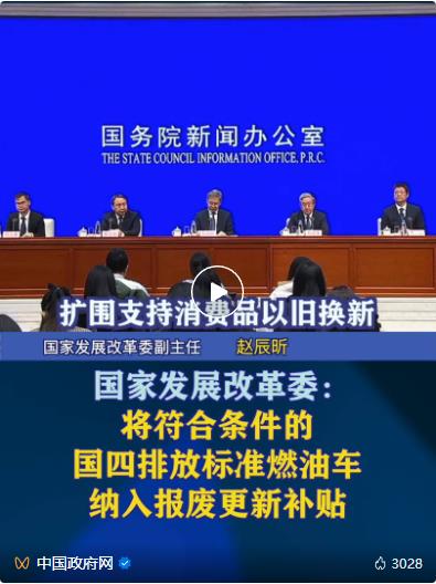國(guó)家發(fā)展改革委:將符合條件的國(guó)四排放標(biāo)準(zhǔn)燃油車納入報(bào)廢更新補(bǔ)貼范圍