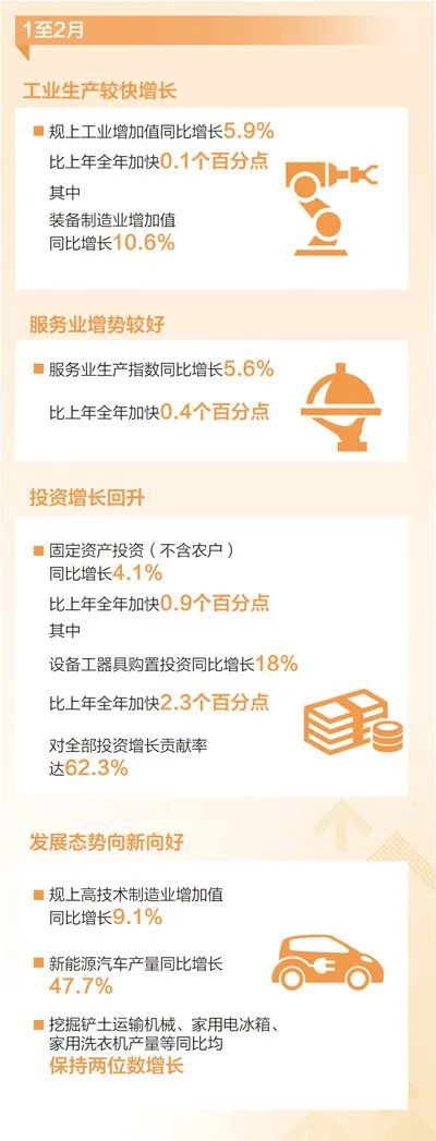 “經(jīng)濟運行起步平穩(wěn),發(fā)展態(tài)勢向新向好。”付凌暉介紹,1至2月經(jīng)濟運行延續(xù)去年四季度以來的回升態(tài)勢,在外部不利影響加深、上年同期基數(shù)較高的條件下保持了總體平穩(wěn),顯示出中國經(jīng)濟的強大韌性。