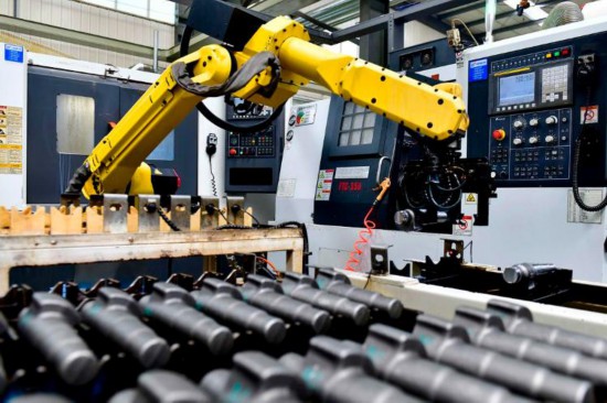 5月21日,金馬工業(yè)集團(tuán)股份有限公司工業(yè)機(jī)器人在加工汽車零部件。