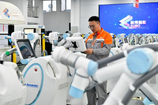 4月1日,在遨博(山東)智能機(jī)器人有限公司,工程師在調(diào)試護(hù)理機(jī)器人。