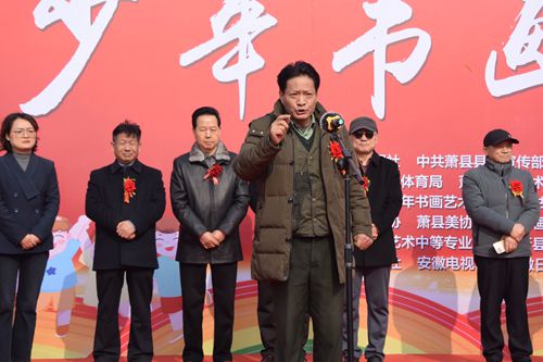 參加開幕式的領(lǐng)導(dǎo)和嘉賓有:中共蕭縣縣委常委、宣傳部部長(zhǎng)馬陽陽,中國(guó)書法家協(xié)會(huì)理事、中國(guó)楹聯(lián)協(xié)會(huì)副會(huì)長(zhǎng)、軍旅書法家倪進(jìn)祥;書法報(bào)社副社長(zhǎng)、副總編嚴(yán)海南,淮北市師范大學(xué)藝術(shù)學(xué)院院長(zhǎng)唐成輝、江蘇師范大學(xué)教授馬亞,中國(guó)書法家協(xié)會(huì)會(huì)員、徐州市青少年藝術(shù)協(xié)會(huì)主席沈鵬、棗莊市書法家協(xié)會(huì)副秘書長(zhǎng)、棗莊市青年書法家協(xié)會(huì)副主席兼秘書長(zhǎng)李川東,中國(guó)書法家協(xié)會(huì)會(huì)員、永城市書法家協(xié)會(huì)副主席(兼秘書長(zhǎng))鄭固華、書法報(bào)社淮北工作站站長(zhǎng)、濉溪縣書法家協(xié)會(huì)副主席(兼秘書長(zhǎng))王梓濤,宿州市教體局關(guān)工委副主任楊權(quán),拂曉報(bào)副主任周紅穎,中國(guó)黃淮網(wǎng)總編輯王艷,安徽金海書畫市場(chǎng)總經(jīng)理邱大偉,蕭縣縣委常委、宣傳部部長(zhǎng)馬陽陽,蕭縣政協(xié)副主席張艷,蕭縣關(guān)工委主任鄭忠亮,蕭縣縣委宣傳部常務(wù)副部長(zhǎng)劉濤,蕭縣縣委宣傳部副部長(zhǎng)徐佩,蕭縣縣委宣傳部副部長(zhǎng)、縣融媒體中心黨組書記孫華,蕭縣教育體育局局長(zhǎng)劉先鋒,蕭縣文化和旅游局局長(zhǎng)吳孝敏,蕭縣文聯(lián)主席夏凌,蕭縣教育體育局關(guān)工委主任、蕭縣青少年書畫藝術(shù)研究會(huì)會(huì)長(zhǎng)杜長(zhǎng)勇。