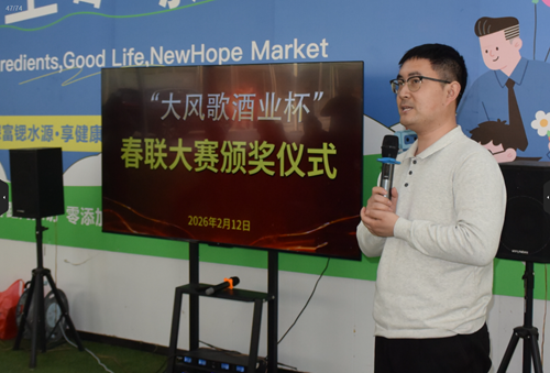 頒獎(jiǎng)儀式上,江蘇新希望生態(tài)科技有限公司總經(jīng)理縱路瑤致歡迎辭;大賽發(fā)起人、主辦單位代表張超介紹活動初衷與組織情況;江蘇大風(fēng)歌酒業(yè)公司董事長袁杰致辭,闡述企業(yè)以文化鑄魂、以品質(zhì)立身的品牌理念;徐州經(jīng)濟(jì)技術(shù)開發(fā)區(qū)書法家協(xié)會主席高軍通報(bào)本次大賽征稿、評審組織與作品評選情況。