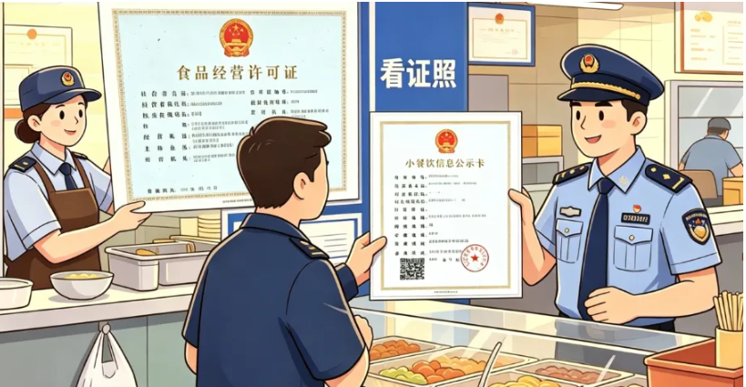 顯著公示《營(yíng)業(yè)執(zhí)照》《食品經(jīng)營(yíng)許可證》或《小餐飲信息公示卡》。