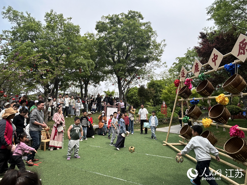 項(xiàng)王故里景區(qū)內(nèi)游客體驗(yàn)蹴鞠游戲。人民網(wǎng)記者 王丹丹攝
