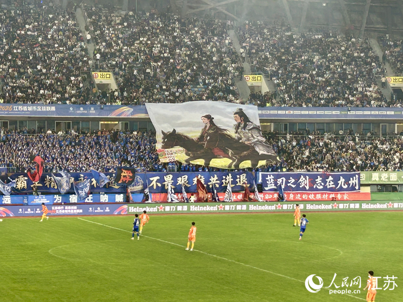 這是4月18日晚“蘇超”新賽季宿遷主場(chǎng)的開(kāi)場(chǎng)陣勢(shì)。宿遷奧體中心看臺(tái)上,一些球迷激動(dòng)得紅了眼眶。為了這場(chǎng)“霸王”歸來(lái),宿遷人期待已久。