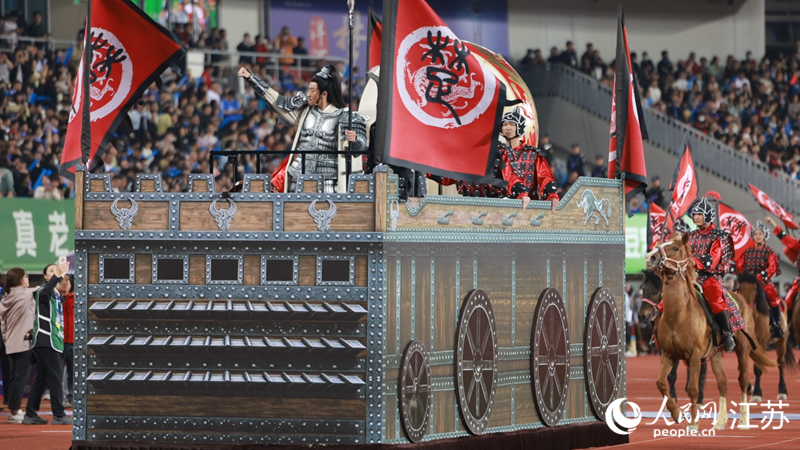 “我項(xiàng)羽回來(lái)了!”演員何潤(rùn)東以西楚霸王的妝扮,乘著戰(zhàn)車?yán)@場(chǎng)巡游,近3萬(wàn)人的吶喊掀起一波又一波聲浪。