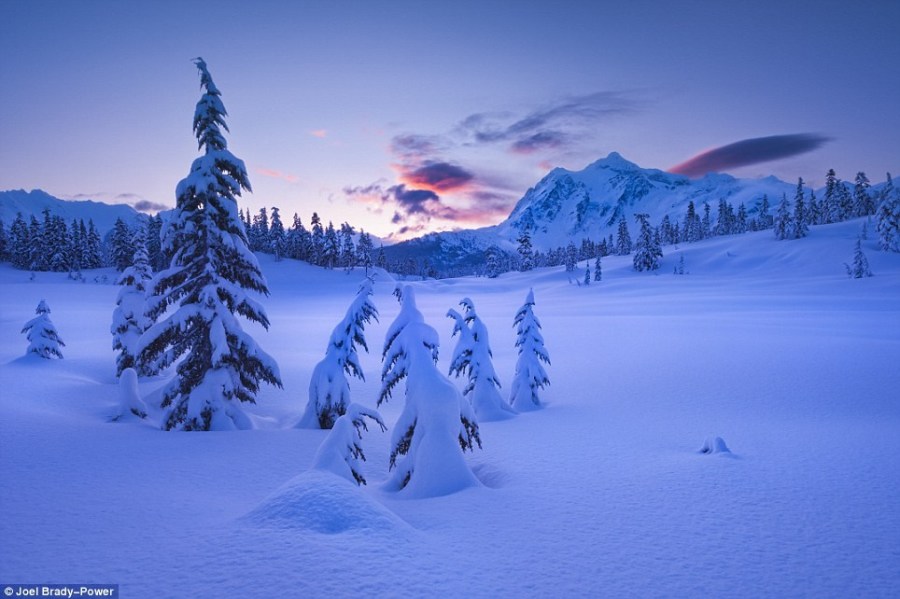 風(fēng)暴后的平靜:華盛頓州,貝克爾山,經(jīng)過三天的暴雪,我穿著雪鞋,踏著及膝深的雪,拍攝到了這張雷尼爾山雪后日出景觀。