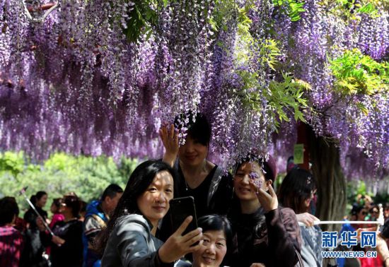 4月17日,游客在上海嘉定紫藤園賞花。近日,上海嘉定紫藤園百余棵紫藤進入盛放期,吸引眾多游客前來觀賞。 新華社記者 劉穎 攝