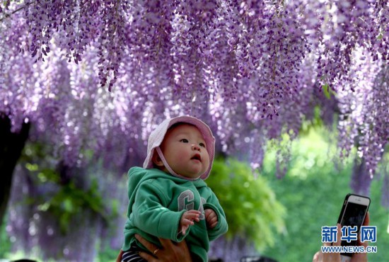 4月17日,一名小朋友在上海嘉定紫藤園賞花。近日,上海嘉定紫藤園百余棵紫藤進入盛放期,吸引眾多游客前來觀賞。 新華社記者 劉穎 攝