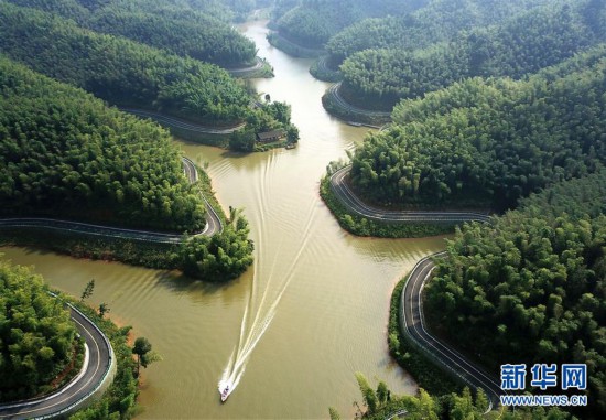8月13日,游客乘坐快艇在赤水竹海國(guó)家森林公園竹海湖上游覽(無(wú)人機(jī)拍攝)。 王長(zhǎng)育 攝