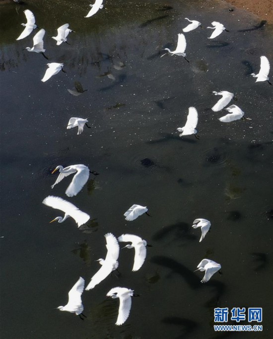 一群白鷺在蝦塘內(nèi)覓食(11月26日攝)。 新華社記者 張愛林 攝
