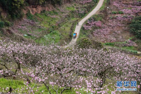 3月21日,當(dāng)?shù)鼐用耨{車駛過成都龍泉驛區(qū)龍泉山的桃花林。新華社記者 張玉薇 攝