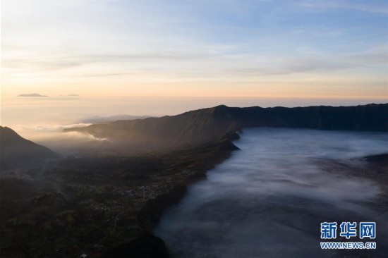 這是5月16日清晨在印度尼西亞東爪哇省拍攝的布羅莫火山群沙海盆地上的云海。新華社記者 杜宇 攝