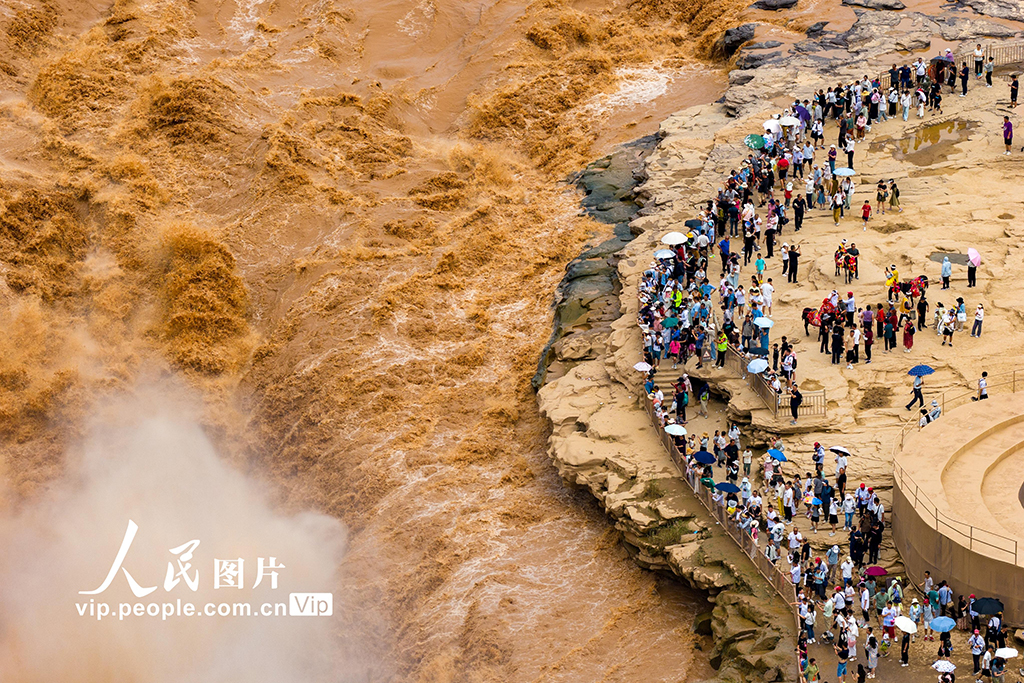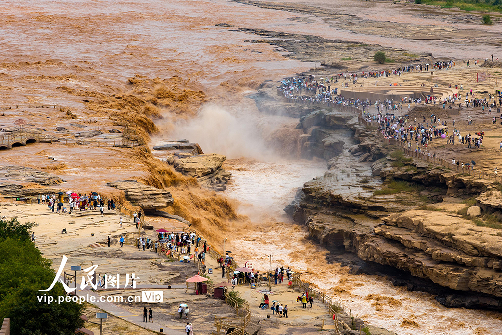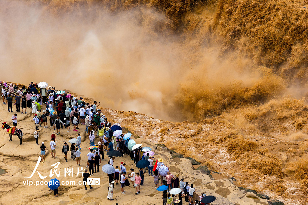 2025年8月11日,陜西省延安市宜川縣黃河壺口瀑布水量大增,金黃色水流攜裹泥沙洶涌奔騰,激起漫天水霧,氣勢磅礴。陜西側(cè)觀景平臺游人如織,游客撐傘駐足,共賞壯麗奇觀。劉一江攝(人民圖片網(wǎng))
