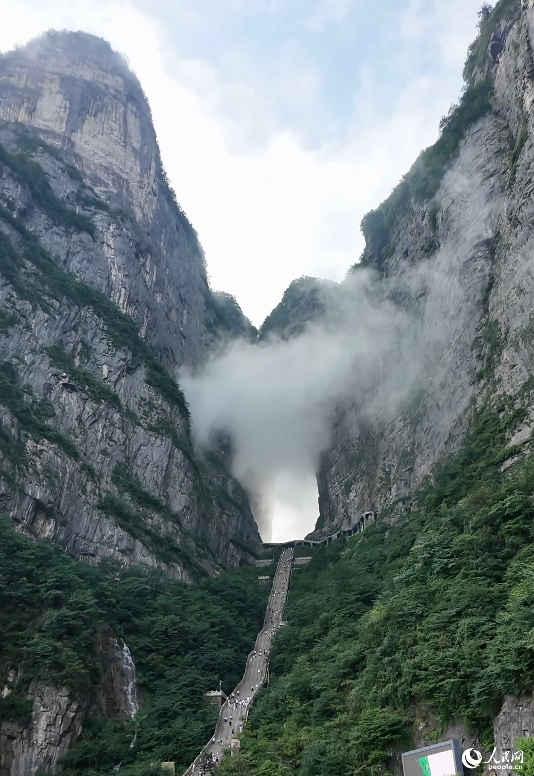 人民網(wǎng)張家界8月12日電 (黃卓)近日,張家界天門(mén)山國(guó)家森林公園景區(qū)云霧繚繞、游人如織。核心景點(diǎn)天門(mén)洞處,呈現(xiàn)天門(mén)吐霧景觀,眾多游客在此駐足拍照。