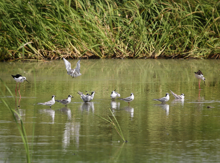 當(dāng)日下午,鄰近湖岸的濕地草叢中,成群鷺鳥或佇立覓食,或于空中翩躚飛舞,宛如優(yōu)美的濕地精靈。尤為引人注目的是,數(shù)只牛背鷺安然立于水牛背上,時(shí)而低頭啄食牛背上的寄生蟲,時(shí)而警覺地抬頭四望,二者形成了默契共生的和諧關(guān)系。 與此同時(shí),在濕地的淺水塘區(qū)域,大批須浮鷗聚集水面,它們時(shí)而低空盤旋,時(shí)而俯沖入水,捕食小魚或水生昆蟲,動作迅捷而優(yōu)雅。黑白分明的黑翅長腳鷸優(yōu)雅地邁著鮮紅色的修長雙腿,在淺水中輕盈漫步,用細(xì)長的喙靈巧地探入水中搜尋食物。 近年來,隨著巢湖流域綜合治理和生態(tài)修復(fù)工作的持續(xù)推進(jìn),巢湖周邊濕地的生態(tài)環(huán)境得到顯著改善,水質(zhì)提升、植被豐茂,為各種鳥類特別是水鳥提供了良好的棲息場所和豐富的食物來源。 據(jù)介紹,此次觀測到多種鷺鳥、須浮鷗、黑翅長腳鷸等鳥類種群活躍,正是巢湖濕地生態(tài)功能持續(xù)向好的有力證明,這也吸引了越來越多的觀鳥愛好者和攝影愛好者前來記錄這些美麗的自然瞬間。(呂歡歡、錢茂松) |