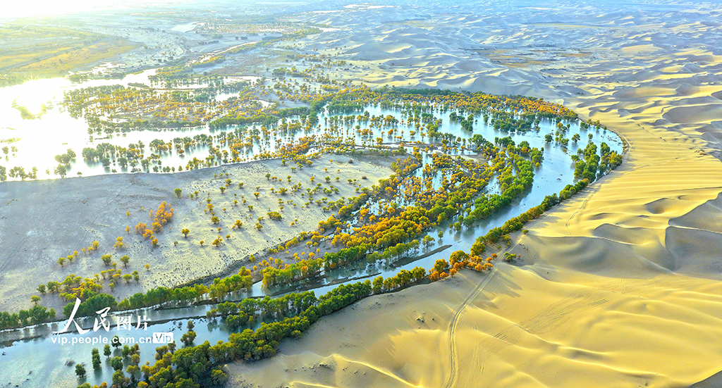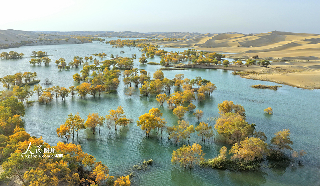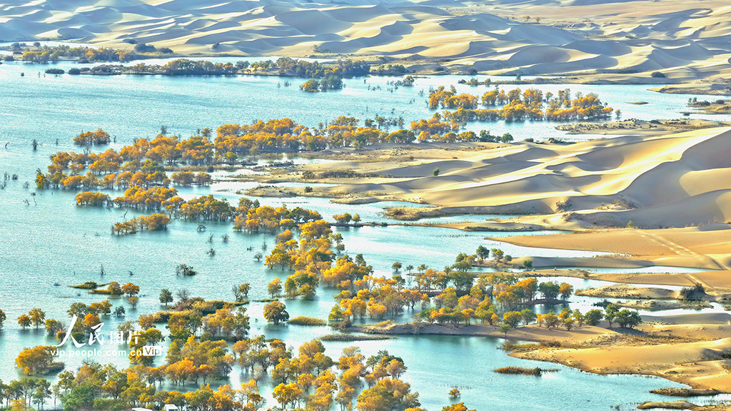 2025年10月6日,新疆巴音郭楞蒙古自治州尉犁縣葫蘆島景區(qū),泛黃的胡楊林與碧水沙丘共同構(gòu)成了一幅秋日畫卷。柴更利攝(人民圖片網(wǎng))