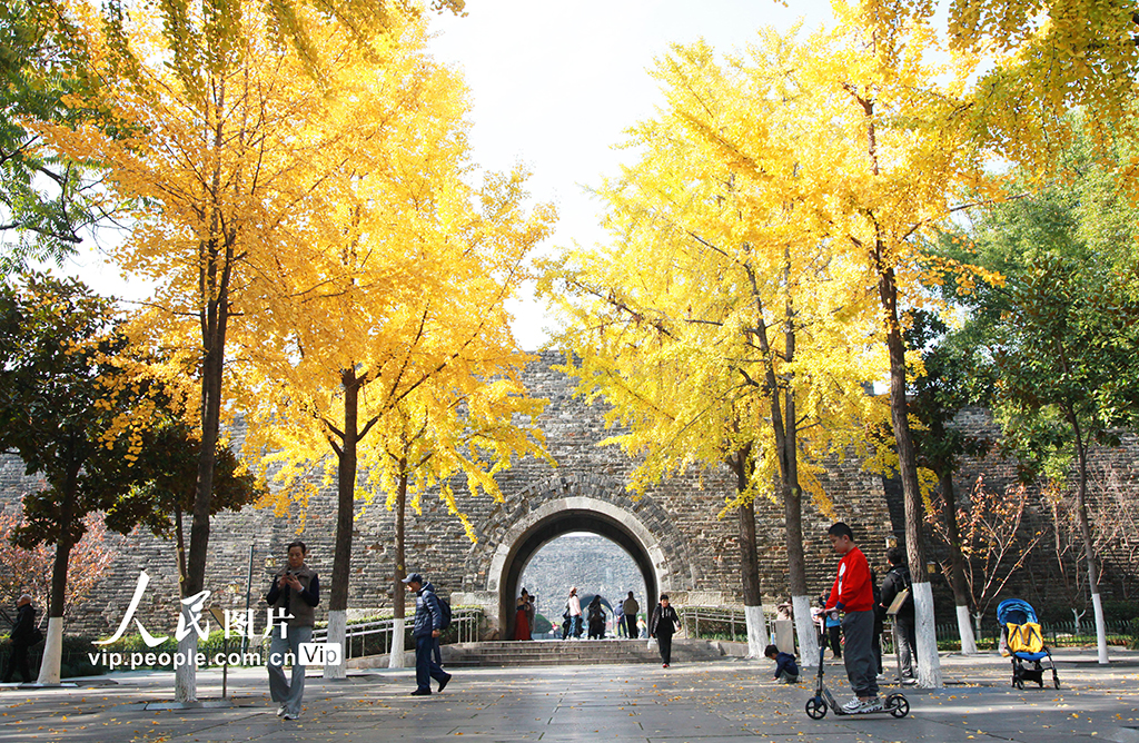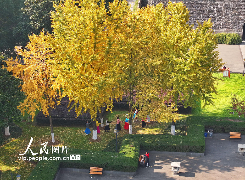 2025年11月23日,江蘇南京漢中門廣場(chǎng)的銀杏樹(shù)身披“金甲”,吸引眾多市民前來(lái)觀賞。劉建華攝(人民圖片網(wǎng))