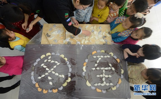 12月20日,揚(yáng)州市杉灣花園社區(qū)開(kāi)展“包餃子 迎冬至”為主題的活動(dòng),揚(yáng)州大學(xué)旅游烹飪學(xué)院的大學(xué)生們將面里添加胡蘿卜汁、菠菜汁、玉米汁、肉餡等食料做成“彩色餃子”與社區(qū)幼兒園的小朋友一起品嘗餃子,在歡歡樂(lè)樂(lè)氣氛中迎接二十四節(jié)氣中的“冬至”到來(lái)。(孟德龍)