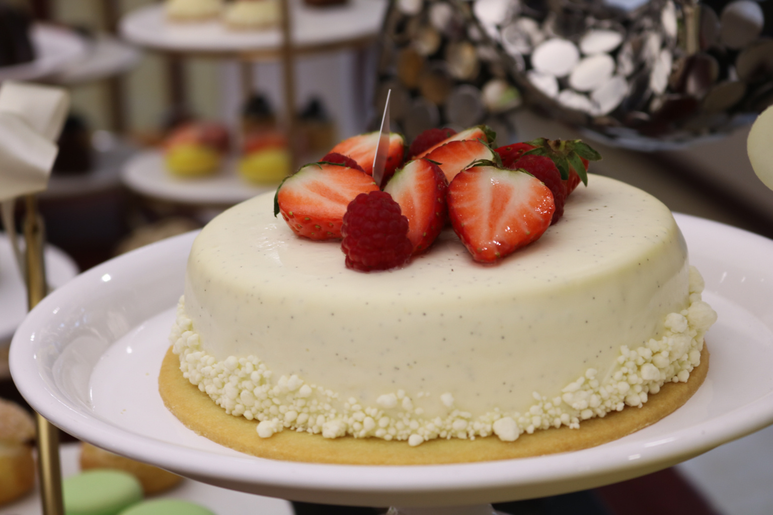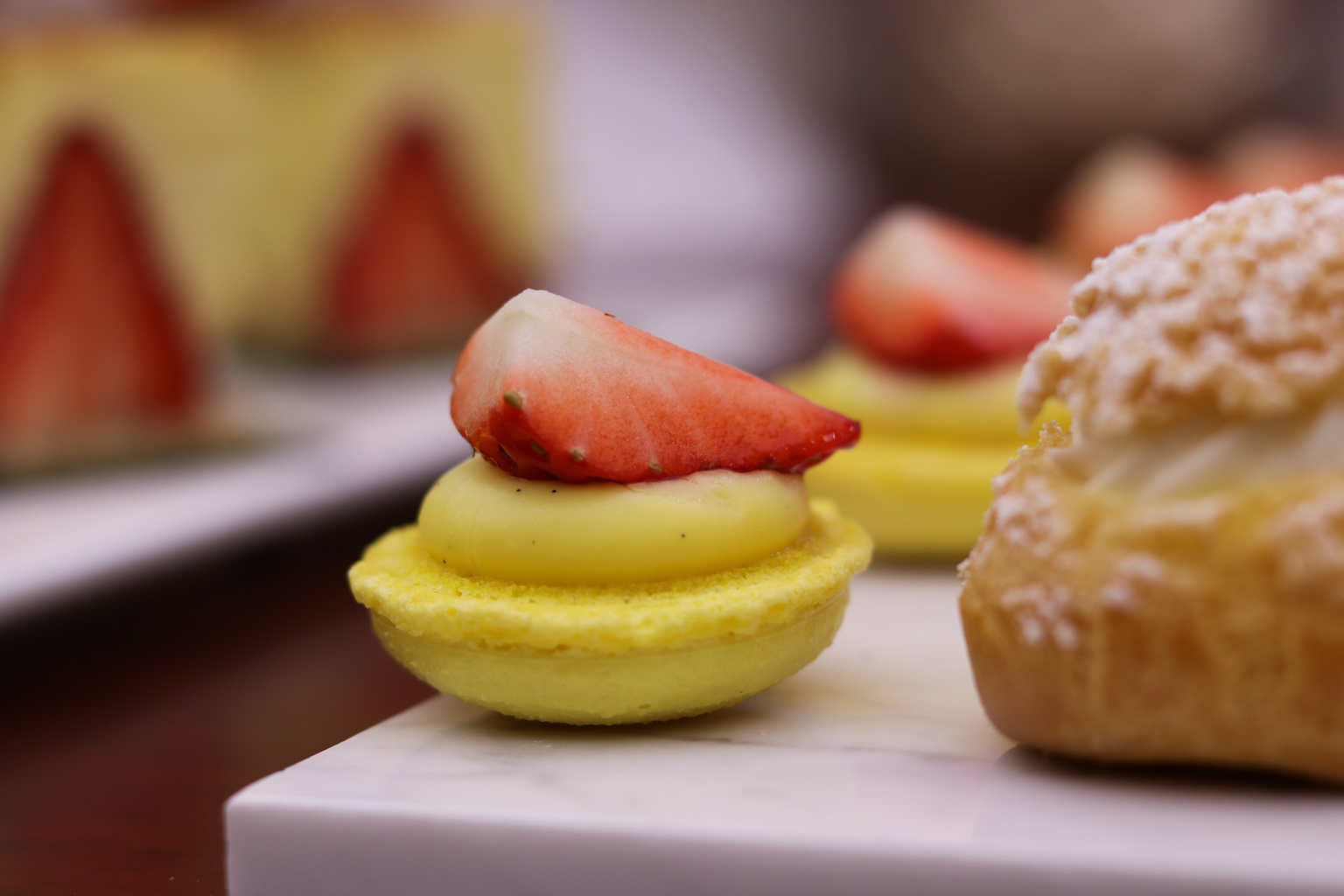 草莓蛋糕:12月應(yīng)季草莓上市,這時候草莓飽滿,用來做蛋糕最好不過。奶油入口卻有一種布丁的Q彈口感,表面融入焦。外表輕奢入口享受。