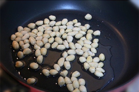 5、涼鍋中放入少許油,然后將花生仁放到鍋內(nèi)。小火炸制花生仁成金黃色撈出晾涼備用。