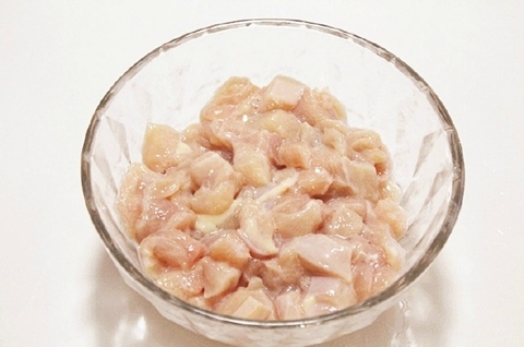 4、用蛋清、1勺淀粉、料酒將雞胸肉抓勻,腌制十幾分鐘。