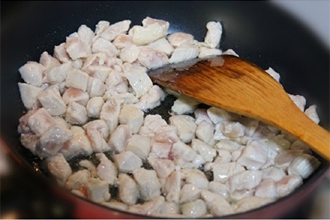 7、將鍋燒熱,然后倒入適量食用油。接下來再把雞肉放入鍋中,迅速打散。雞肉變白 即可盛出備用。