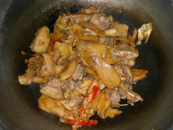 2.鍋中熱油,油稍多一些,下入姜蒜和辣椒熗鍋,出香后放入鴨塊,烹入料酒翻炒