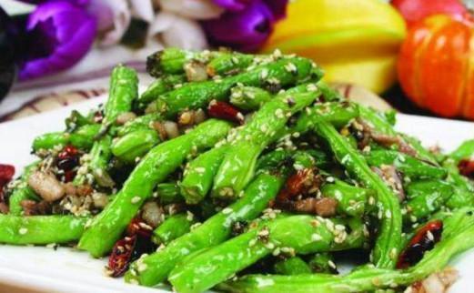 材料:扁豆400克,肉末150克、干辣椒4個(gè),老抽1大勺,榨菜末、花椒、蒜粒、鹽、味精各適量