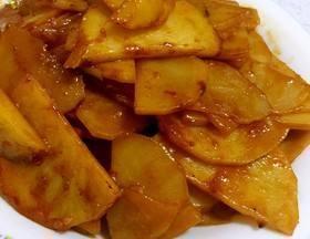 3.鍋中放適量油燒至五成熱,放入蒜末和紅干椒爆香,倒入土豆片大火翻炒均勻;