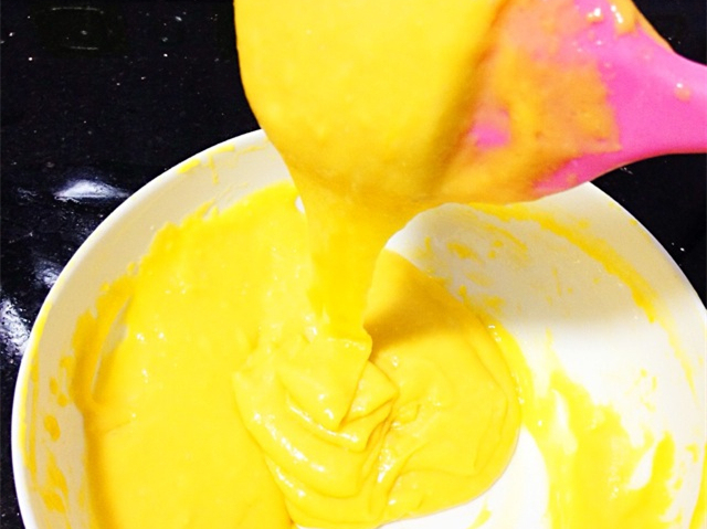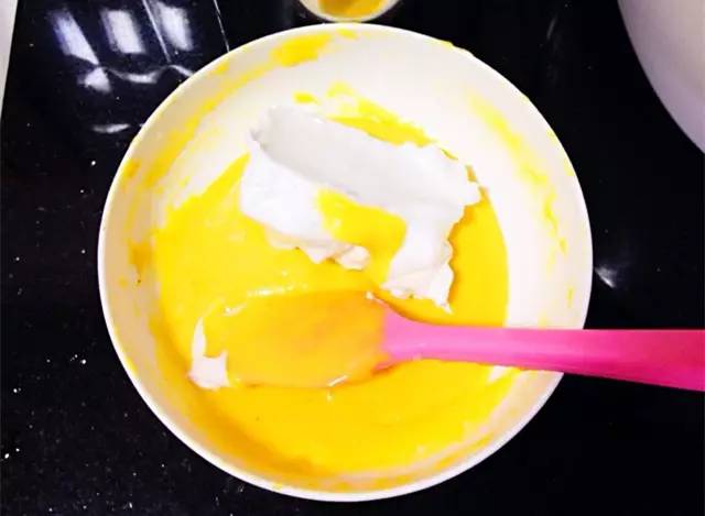 12. 預(yù)熱電飯鍋的同時,取出蛋黃糊,加入三分之一打發(fā)好的蛋白拌勻。一定不能劃圈攪拌以免蛋白消泡,只能用翻拌或者切拌的手法。