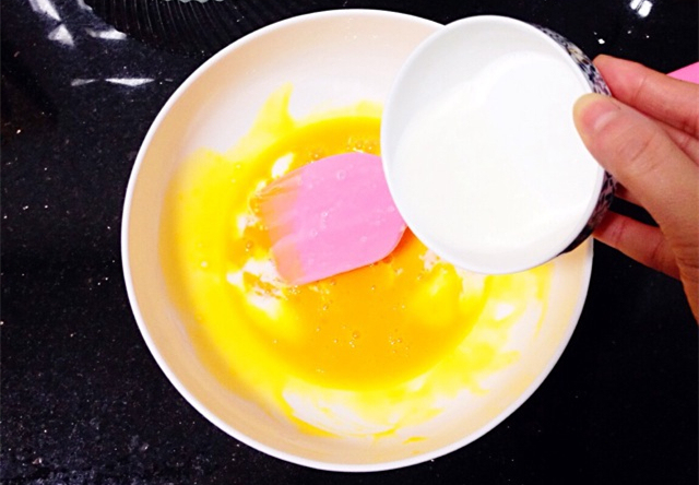 3. 先來制作蛋黃糊。蛋黃打散后加入牛奶,攪拌至蛋液與牛奶完全融合。