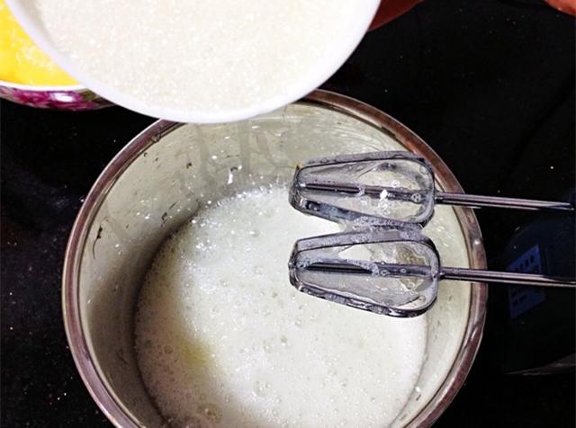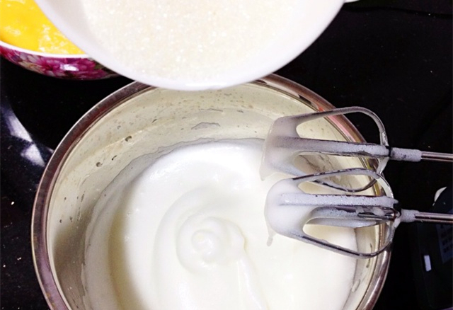 9. 打至六成濕性發(fā)泡時加入第三次白砂糖。