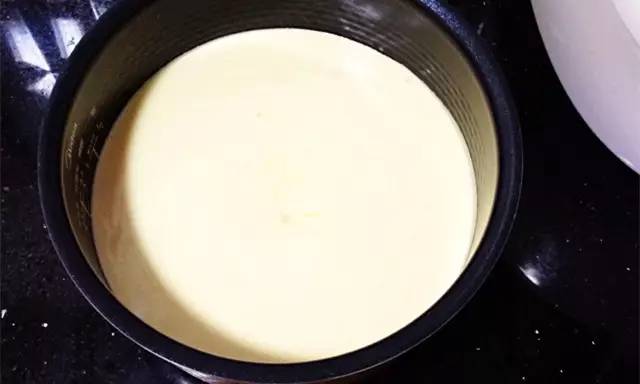 14. 取出預(yù)熱好的內(nèi)膽(小心燙手)倒入拌好的蛋糕糊,并放臺面輕摔震出大的氣泡。