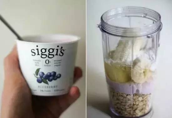 1.將麥片倒入攪拌機(jī)內(nèi),加開水,記得不要放太多,如果你喜歡香蕉的話也可以加入一些香蕉開始攪拌。將藍(lán)莓清洗備用