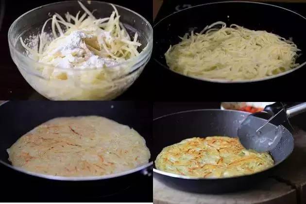 3.不粘鍋中火熱油,將土豆絲面糊倒入鍋中煎2分鐘,至成型,金黃色,翻面繼續(xù)煎,煎至涼面金黃酥脆,起鍋