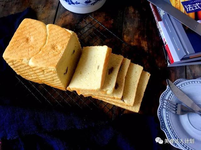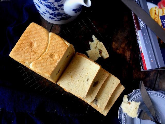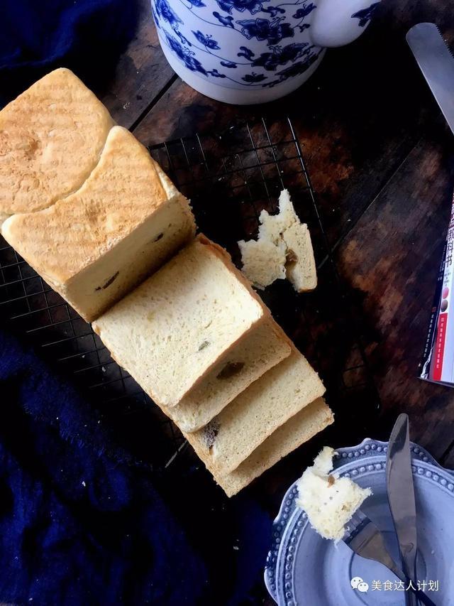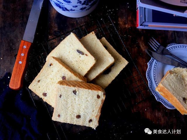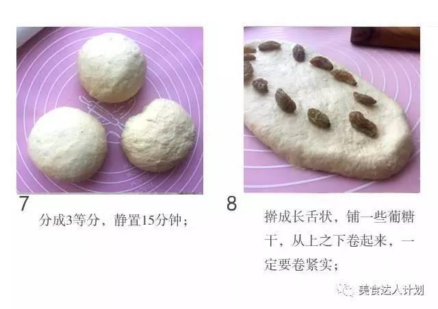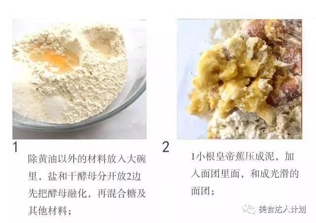 配料:高粉350g 雞蛋1個 細糖55g 牛奶100ML 黃油25g 干酵母4g 鹽2g 皇帝蕉1個 中種面團80g 葡萄干適量