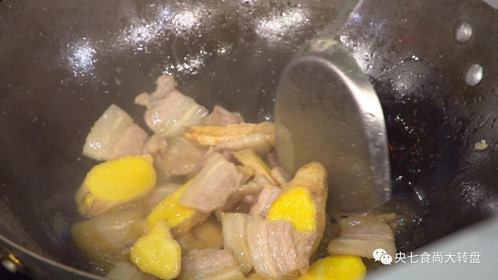 2、另取一鍋,將五花肉切片后下鍋翻炒,分別加入料酒姜片,再倒入魚湯鍋里燉15分鐘左右。