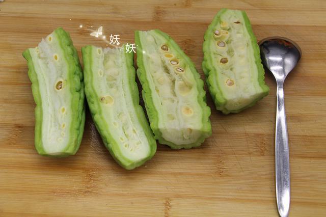 4,苦瓜的苦味來自于內(nèi)瓤和果肉之間的這層鏈接層,只需用小勺子把這層貼近果肉的綿軟組織刮去就不會(huì)有苦味,喜歡苦味的可以稍微留一些,不喜歡吃的就全刮干凈。