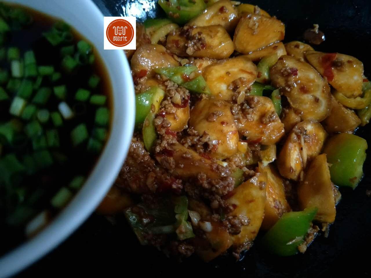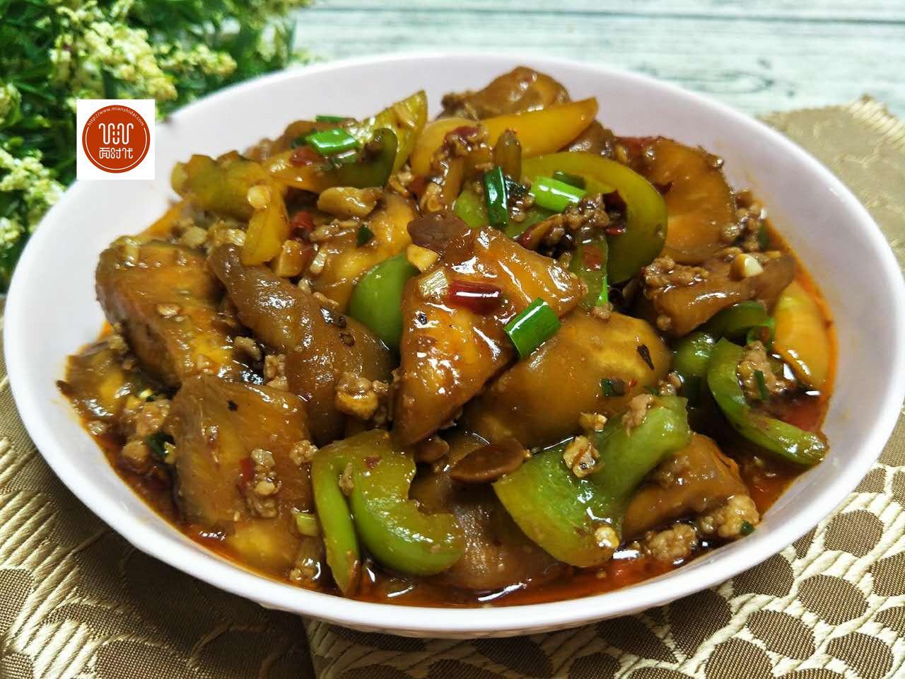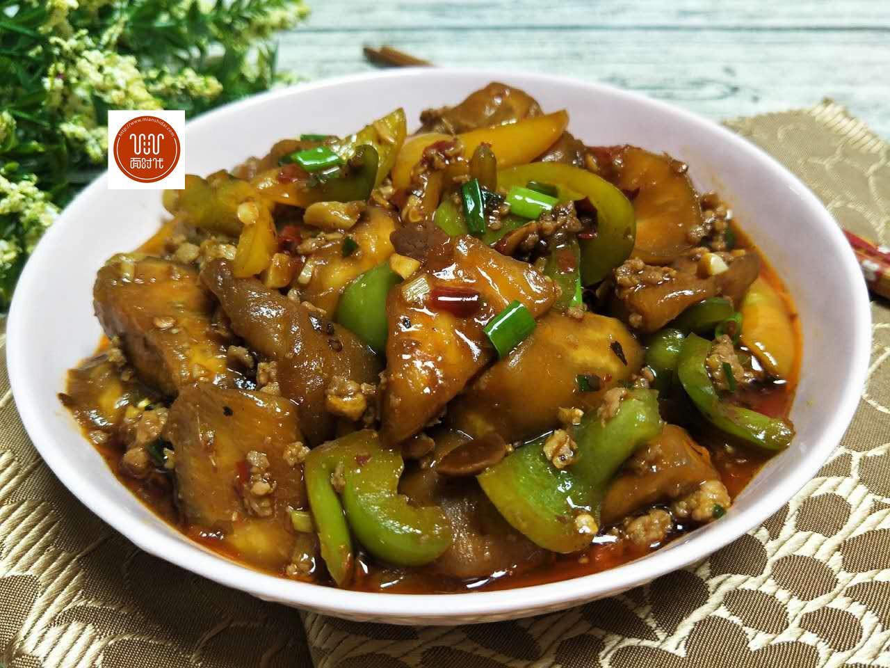 食材:茄子1根、肉末100克、柿子椒1個(gè),鹽半勺、郫縣豆瓣醬1勺,生粉半勺、生抽1勺,蠔油1勺,白糖半勺,胡椒粉半勺、水小半碗,蔥姜蒜適量。