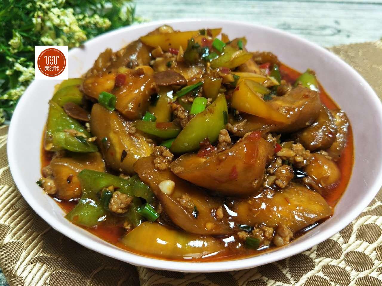 7、加入腌好的茄子,翻炒勻,讓茄子均勻的裹上醬料。