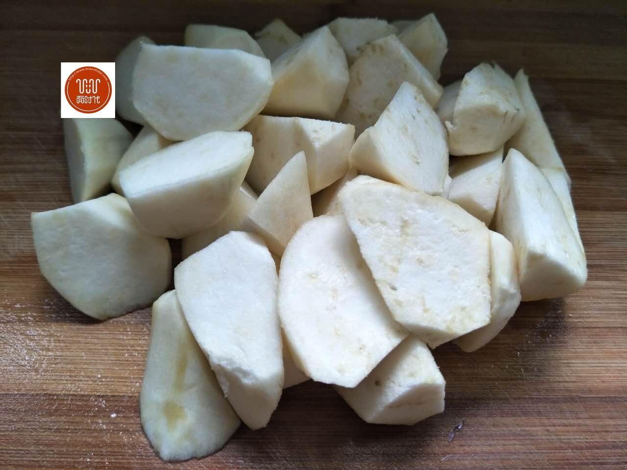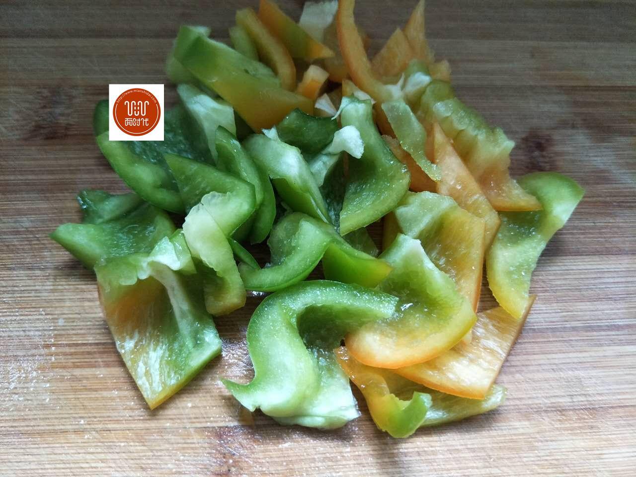 2、柿子椒切塊備用。